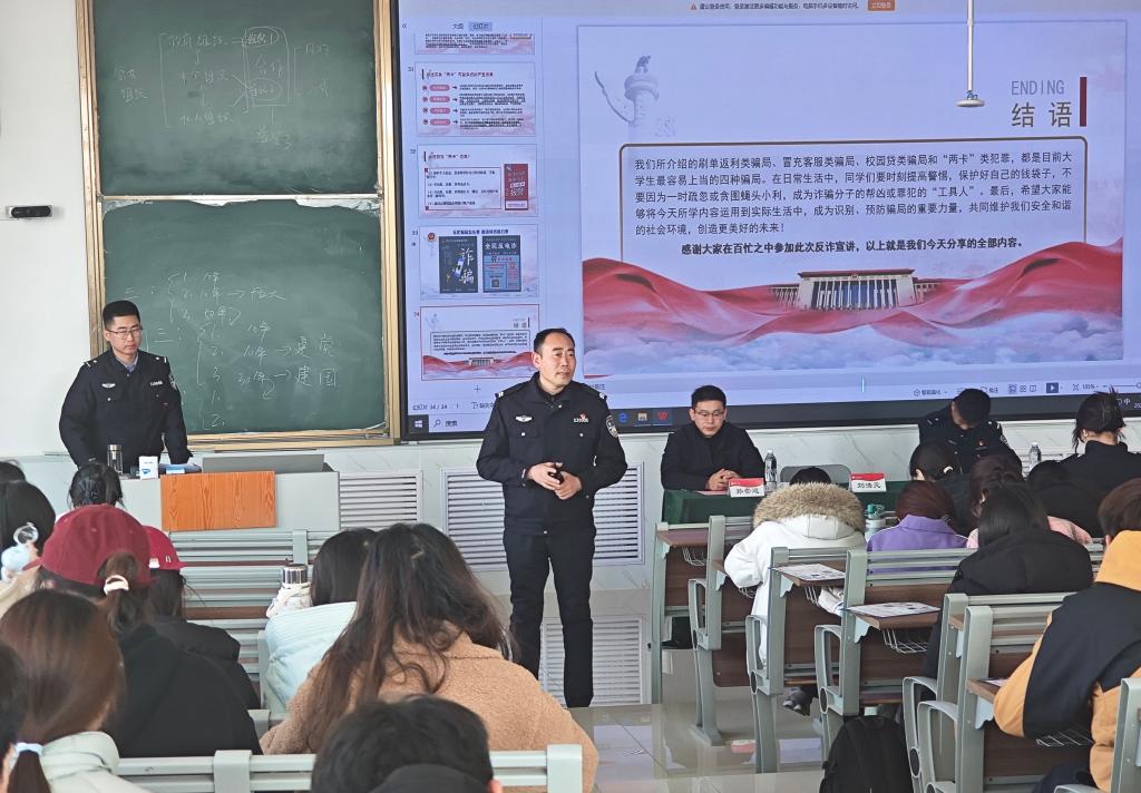 在宣讲过程中,刘浩元结合自身丰富的办案经验,详细介绍了当前诈骗犯罪的新形势、新特点以及常见诈骗手段。他通过真实案例的深入剖析,生动展示了诈骗分子的惯用伎俩,如网络兼职刷单诈骗、虚假投资理财诈骗、冒充身份诈骗等,让同学们深刻认识到诈骗行为的隐蔽性和危害性。