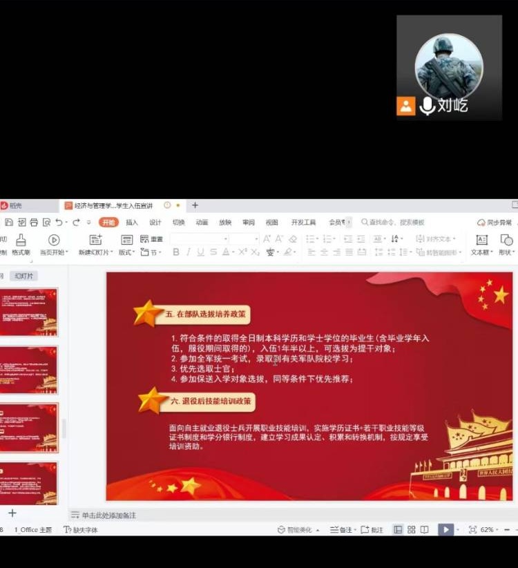 为扎实推进我院2022年度秋季征兵工作,让广大同学充分了解此次征兵政策,7月9日与10日晚,bevitor伟德国际1946通过线上会议的形式召开了2022年度在校大学生及毕业生秋季征兵宣讲会,两场征兵会议由我院辅导员李家家主持,我院国防教育部退役士兵何金泰、刘屹主讲,我院全体男生参会。