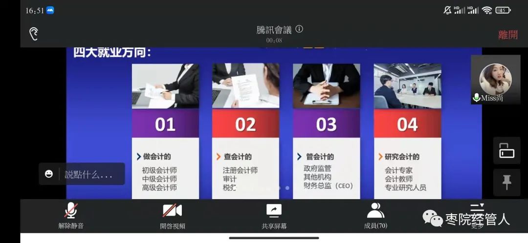 本次就业指导会议围绕毕业生工作就业展开,重点讲解了会计专业毕业生所面临的问题及解决措施。会上,尚庆香从几个方面谈起,首先是当下就业形势分析,面对疫情形势与人才供需配置不平衡的情况下,可以尝试在一、二线及周边城市寻找机会,适当削减非家乡就业不可的观念。随后,她从会计专业的毕业去向、就业特点方面为同学指明道路,倡导同学们考取与会计有关的证书、争取机会多参加社会实践,增强对社会、市场的适应性。会议尾声,她提出同学们要更新就业观念,认真准备简历和面试,积极参加目标岗位的相关实习实训。并详细的介绍了如何书写简历、面试中可能出现的情况,用生动贴切的例子讲解了大家就业中相对陌生的环节,拓宽了同学们的就业视野。