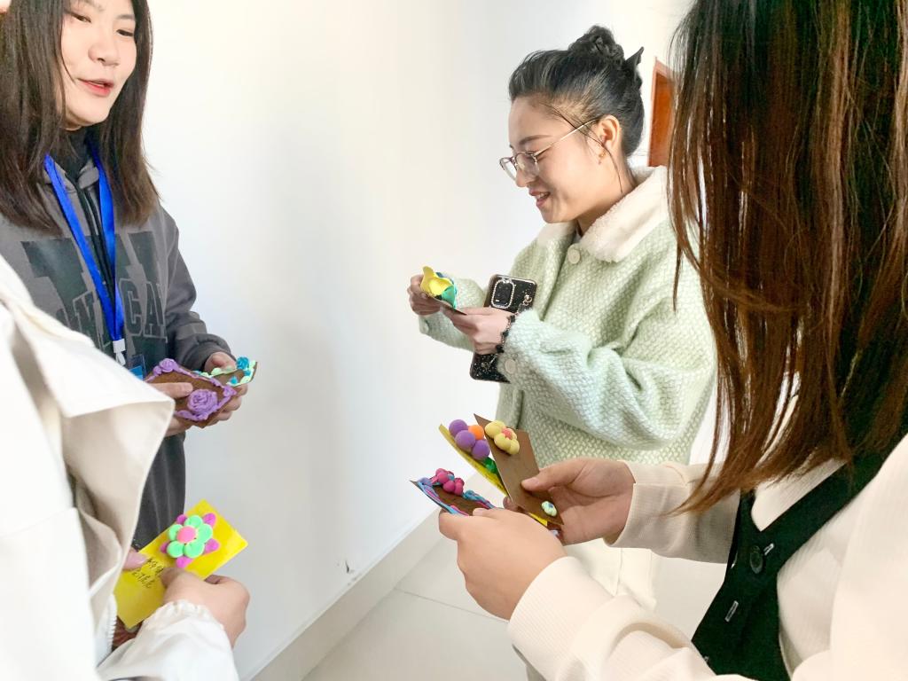学生们为我院女教师献上了亲手制作的明信片,“祝你优雅如菊花,天天乐开花”“愿一切美好如约而至,愿您青春永驻,女神节快乐”明信片上各式各样的祝福语,表达着对老师的美好祝愿。每张明信片上都点缀着学生亲手制作的纸花,象征着我们对老师教诲之恩的感激之情,寓意着老师如花朵一样芳香不散,感染他人。在一片欢声笑语中,老师收下了学生们献上的礼物,真切地感受到了学生真挚的祝福和爱戴,现场氛围其乐融融,气氛融洽。