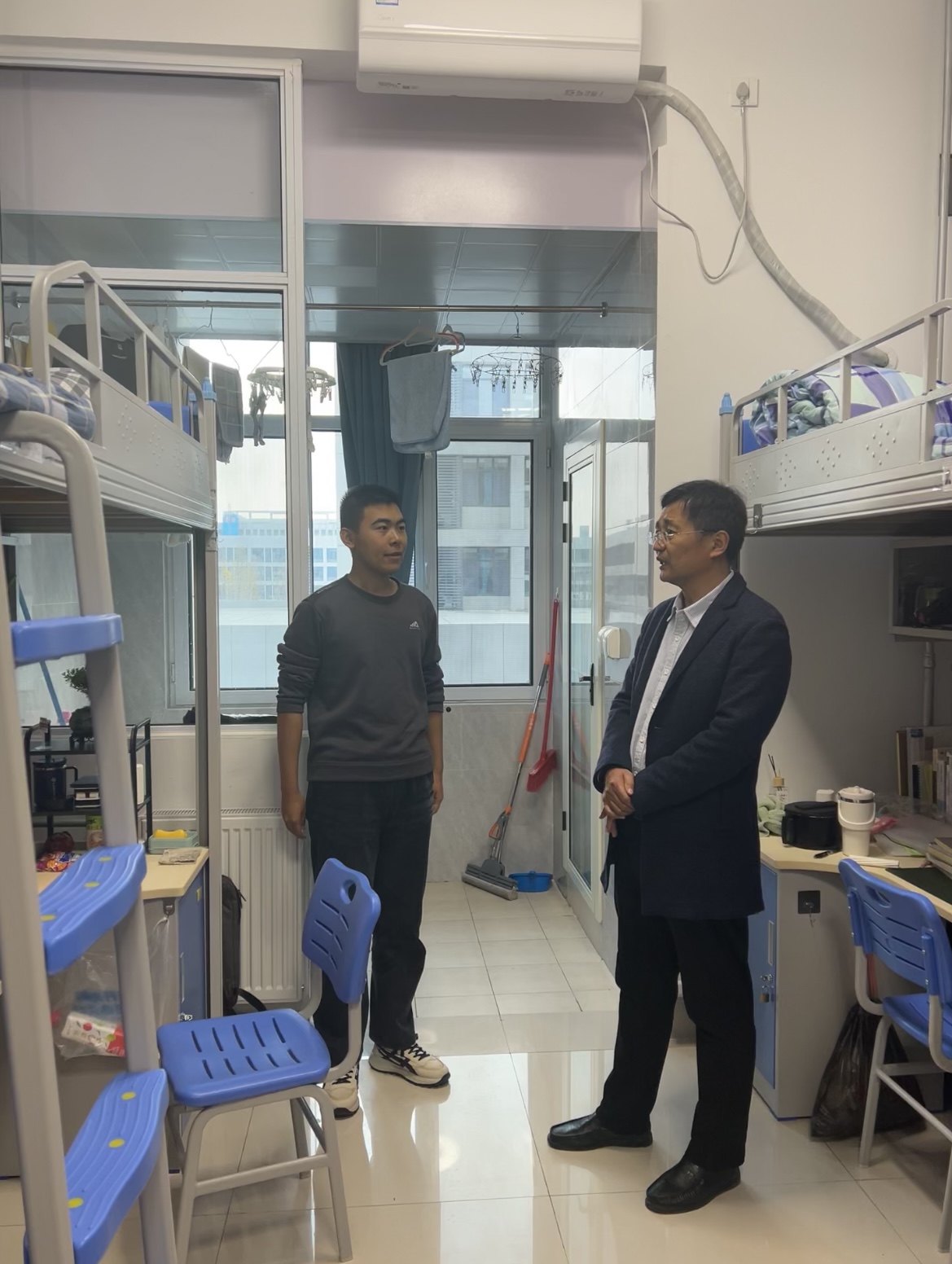 此外,艾衍辉还与宿舍楼栋管理人员进行了深入交流。他详细了解了宿舍楼栋的管理情况以及学生的意见和建议。他表示,学院将进一步加强与宿舍楼栋管理人员的沟通与协作,为学生们营造一个更加安全、文明、卫生的宿舍环境。