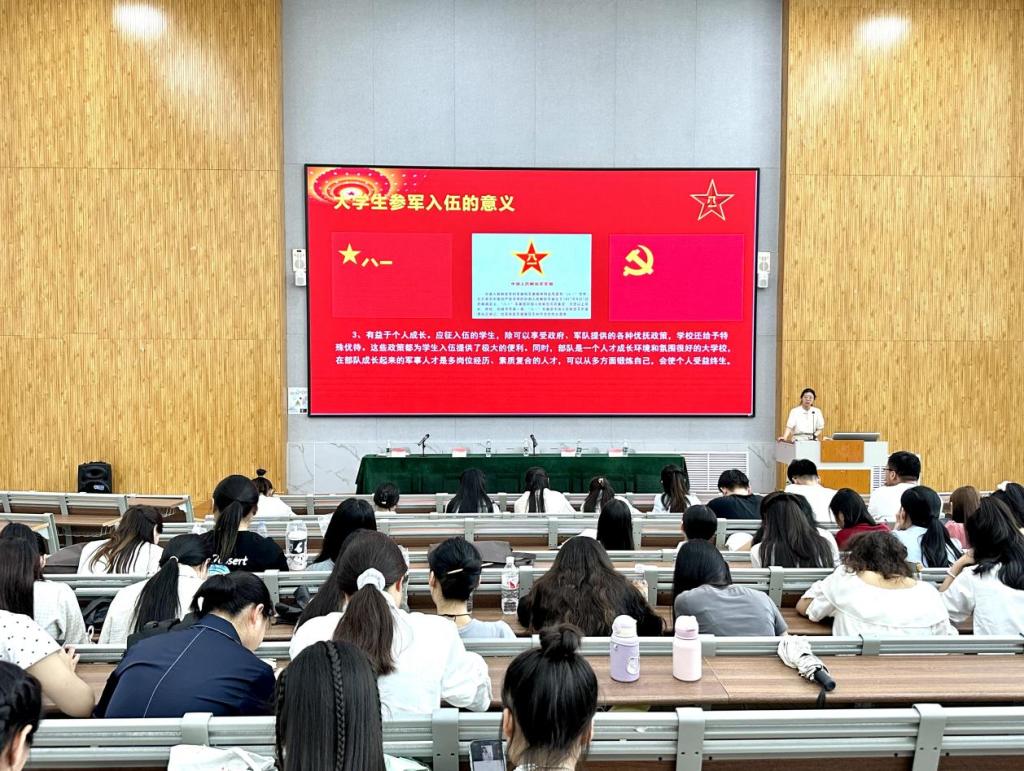 辅导员亓贵芝向毕业生介绍了征兵政策的重要意义,强调了毕业生参军入伍对于国家和个人发展的双重价值,详细解读了国家征兵政策的相关内容,包括征兵对象、条件、流程、优惠政策等方面,使毕业生对征兵政策有了更加清晰的认识。亓贵芝号召广大青年学生积极参军,在军队中报效祖国,实现人生价值。她进一步说明,军队不仅是保卫国家的钢铁长城,更是锤炼个人意志、提升综合能力的绝佳平台。毕业生在军队中能接受严格的军事训练和思想教育,培养坚韧不拔的毅力与团队协作精神,这些宝贵经历将成为他们未来职业发展与人生道路上的强大助力。