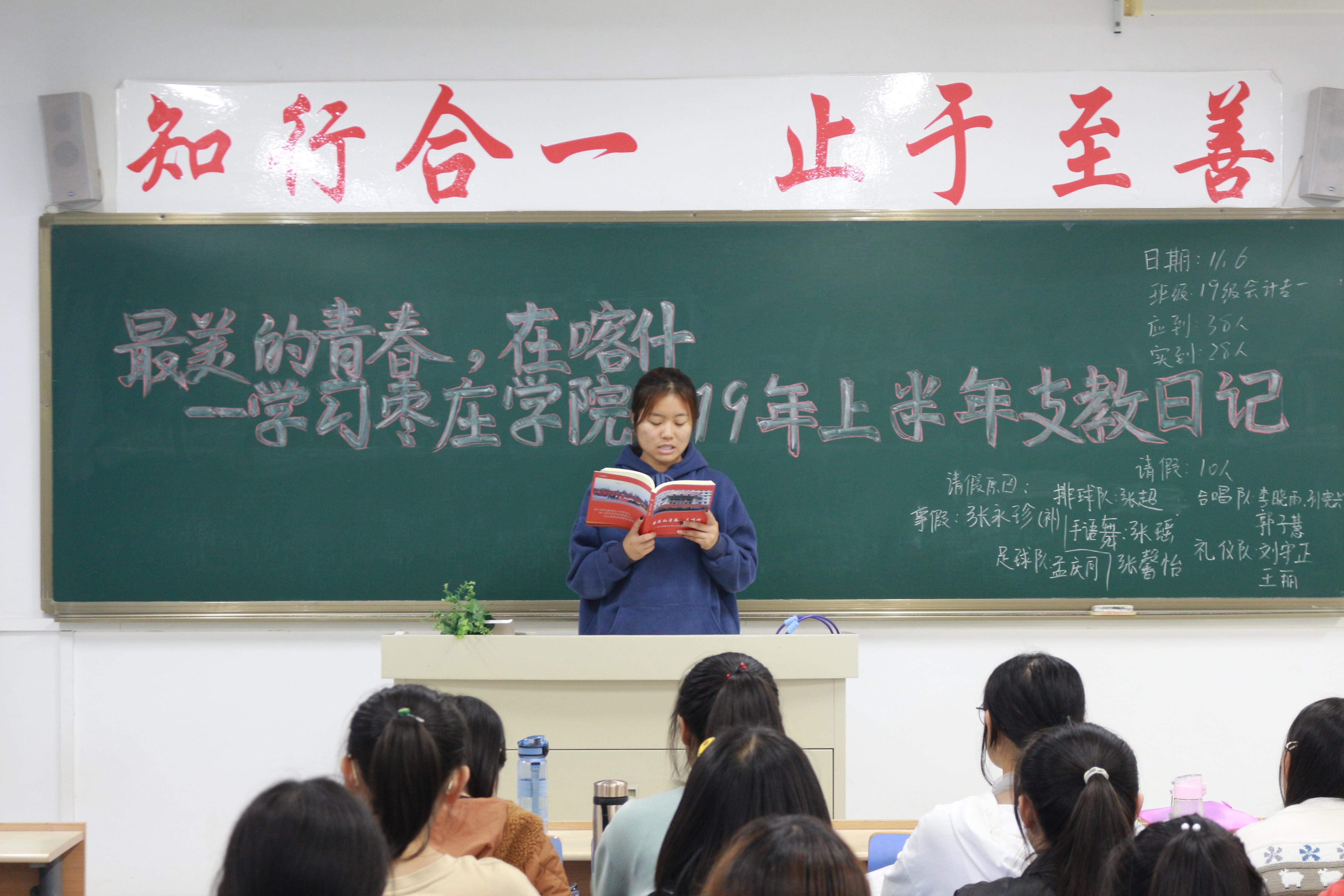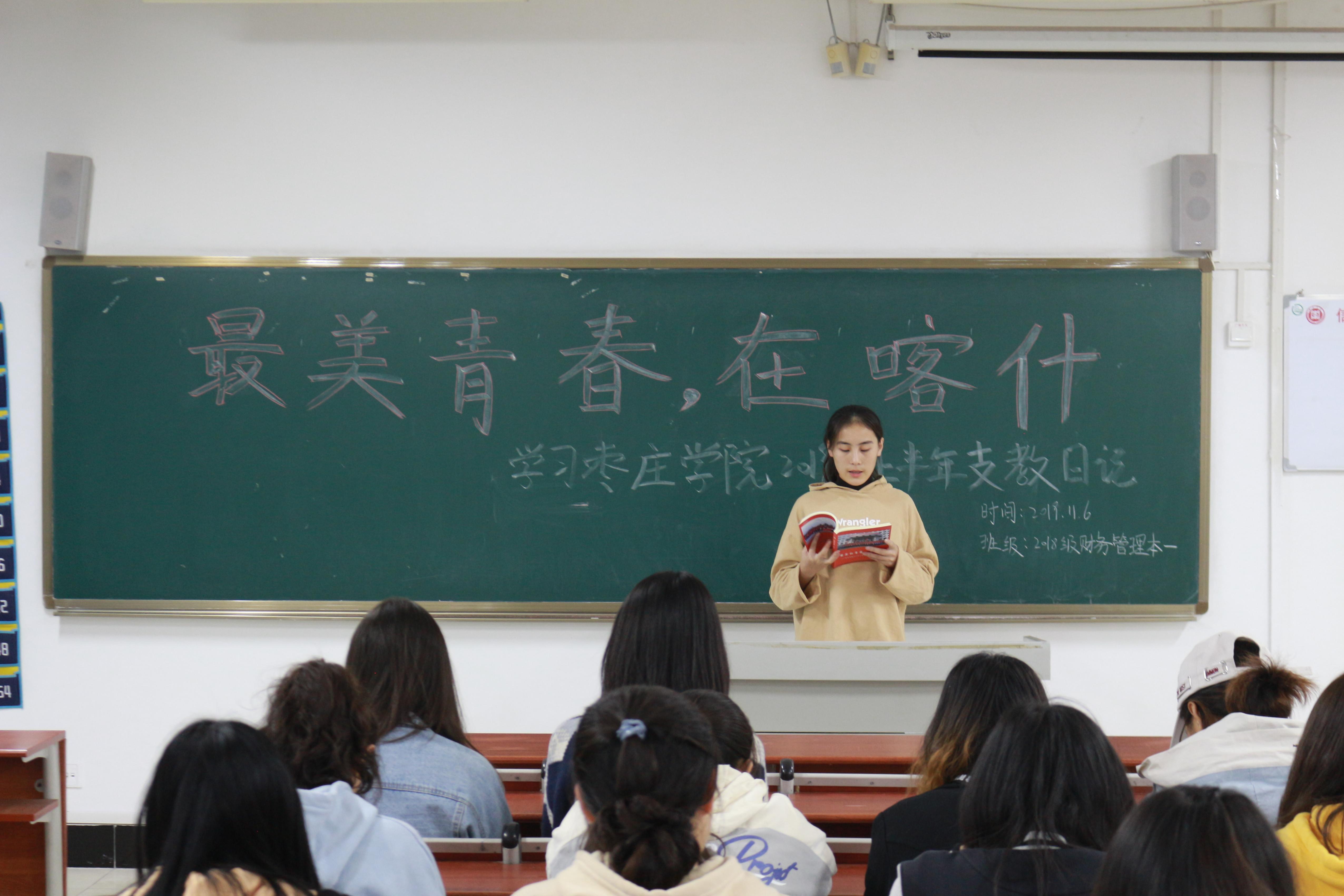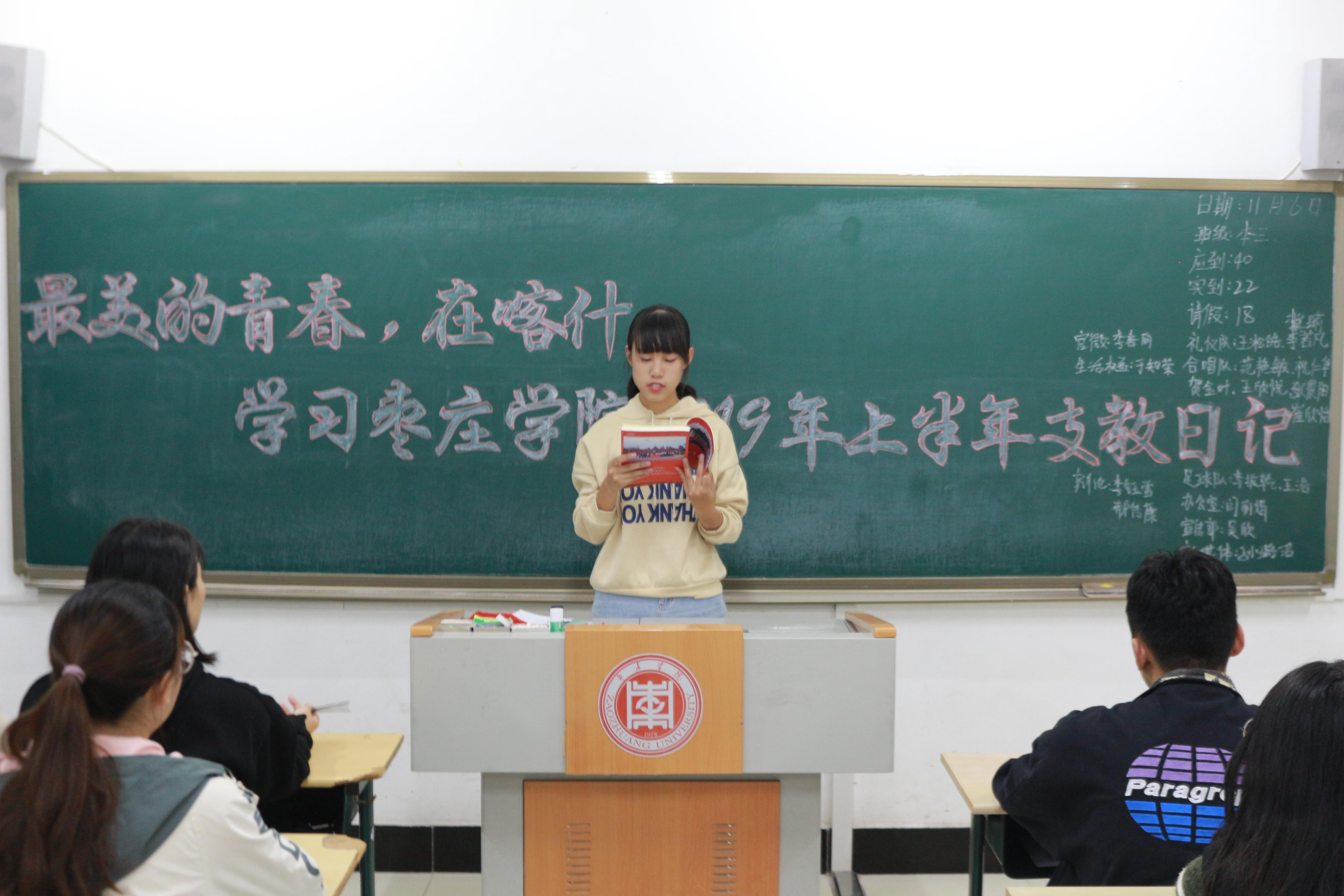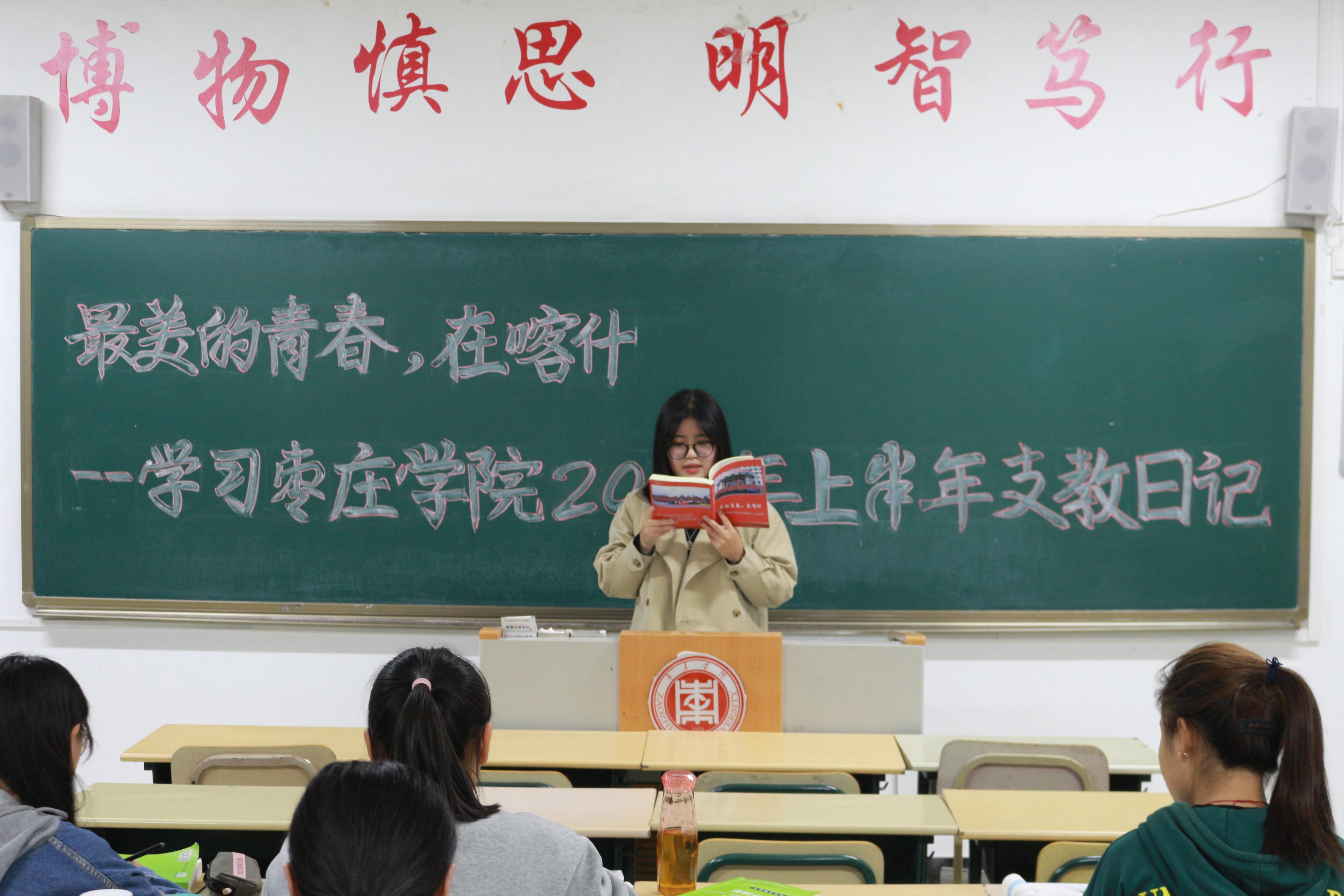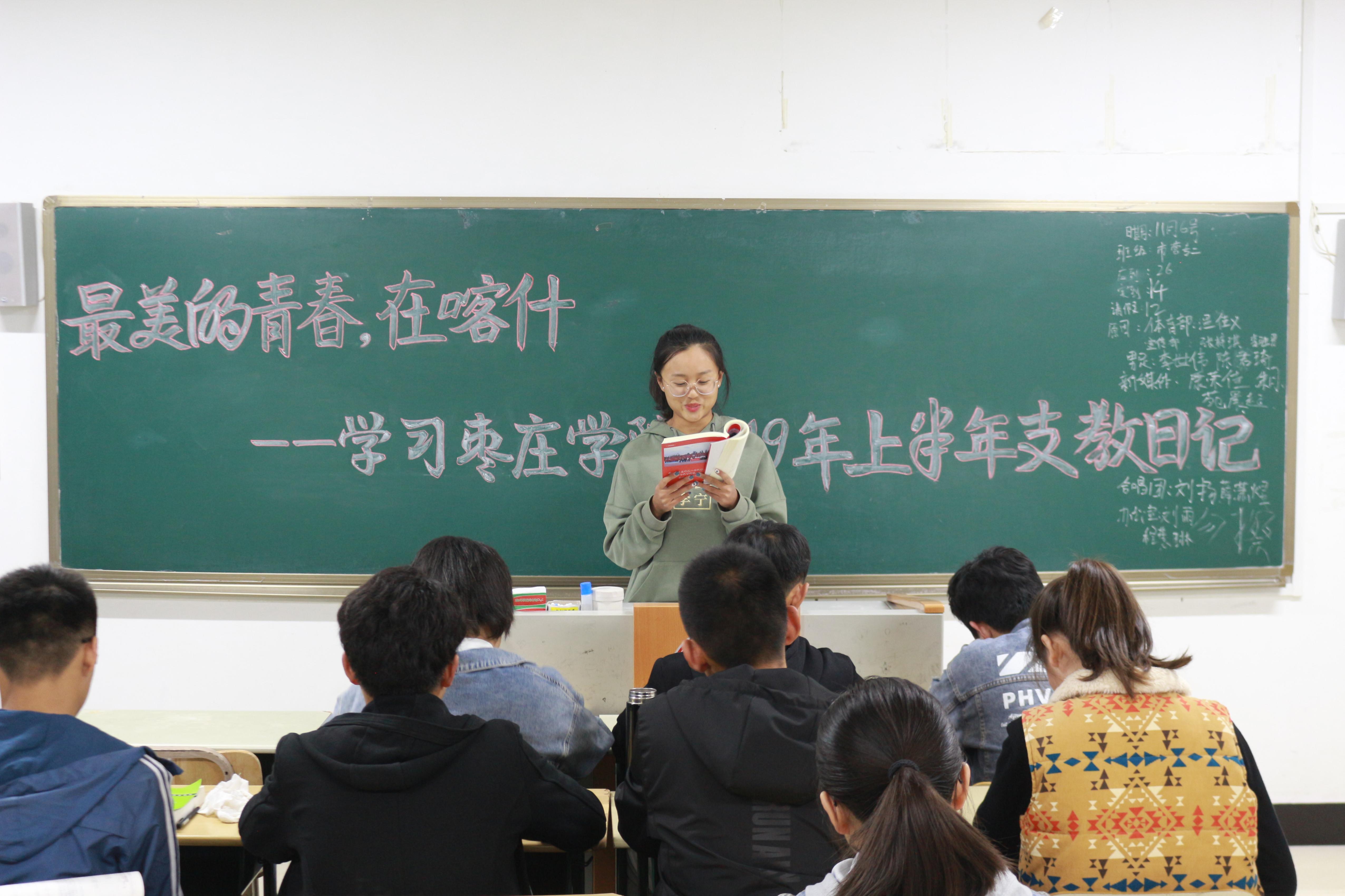 本次团日,各班团支书以支教日记、支教征文为切入点,进一步加深同学们对支教生活的认识与了解,激发同学们的责任感和使命感,树立投身边疆的理想信念。将边疆支教与社会实践相结合,以黑板报的形式对学生进行奉献青春支教宣传。学习期间同学们认真听讲,积极参与,各班学生代表以发表演说的形式,表达了自己对大学生支教生活的深切感悟。