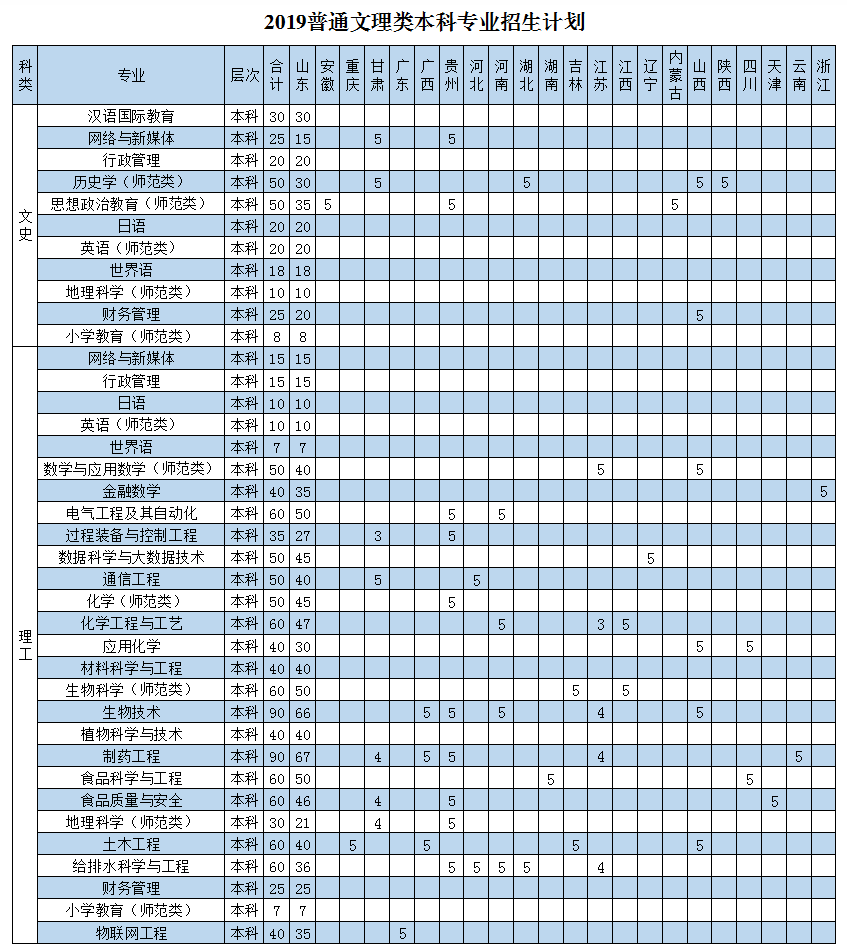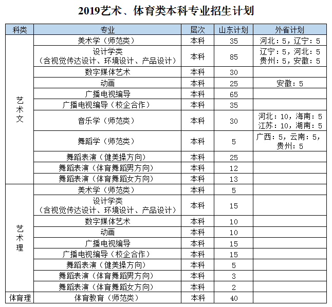 2019年我校面向全国25个省(市、自治区)计划招生4640人,其中:本科计划3240人(山东省外计划385人),专科计划1400人。