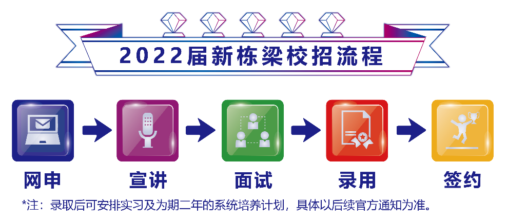 网申—校园宣讲—面试—发放录取通知(注:录取后将进行实习安排和为期二年的培养计划,具体以后续通知为准。)